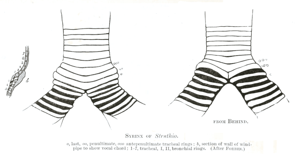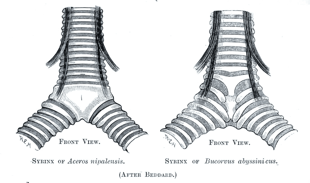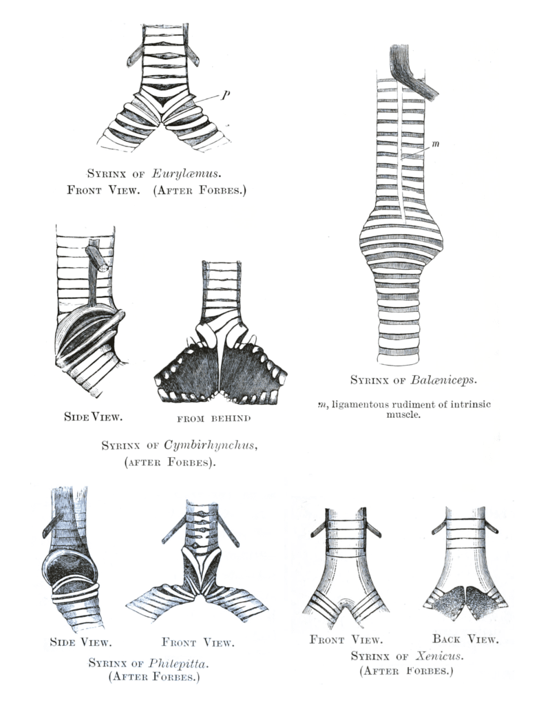 Warner, Robert W. (1972). “The anatomy of the syrinx in passerine birds”. Journal of Zoology. 168 (3): 381–393. doi:10.1111/j.1469-7998.1972.tb01353.x.